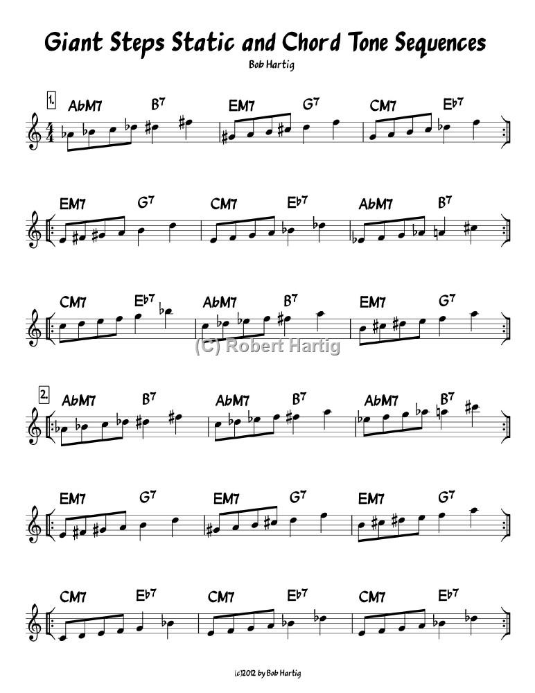 Don’t be cowed by this post’s heady subtitle, “Static and Chord Tone Sequences.” I’m just not sure how else to describe this material. The goal I’m after is to work with linear sequences that will drill the shifting tone centers of Coltrane changes into my fingers. (Geeze, that still sounds murky as all get-out. Oh, well. Deal with it.)