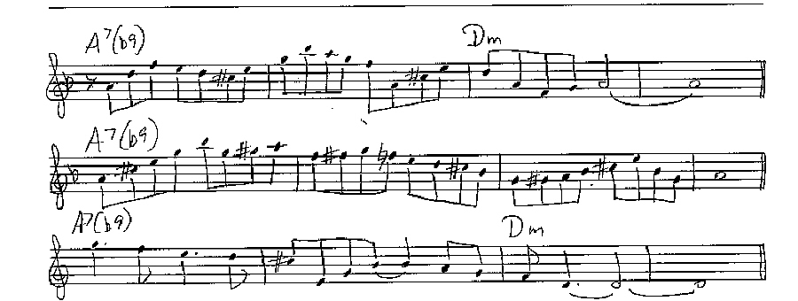 The harmonic minor scale was the first scale I learned to apply in a minor jazz setting over an altered dominant chord. No doubt that was because it was the easiest, but it also seemed to me to be the most consistent with the vocabulary of bebop a la Charlie Parker. Just as a given major scale generates the appropriate Mixolydian mode for the dominant of its key, so a harmonic minor scale produces a scale that works well with its dominant. Known as the Phrygian dominant (aka Jewish scale, Gypsy scale, or Spanish scale), this scale works beautifully with V7b9 chords. With its lowered sixth, and with the minor third interval between its lowered second and major third, it possesses an evocative, Eastern quality that makes me think of belly dancers and snake charmers.