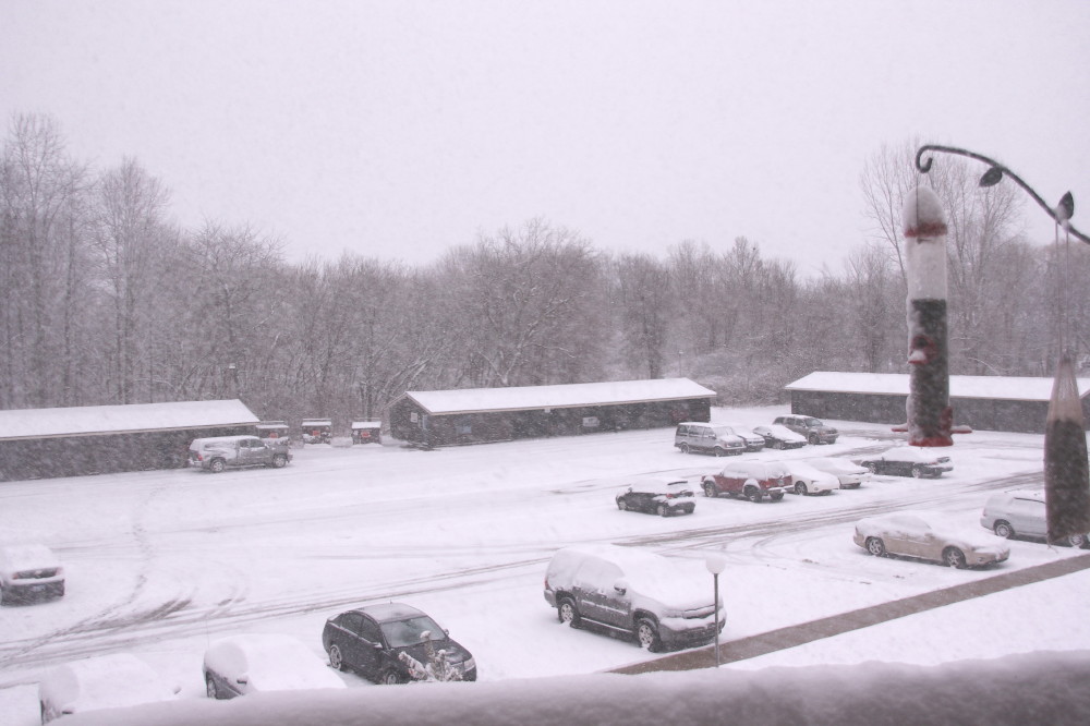 And the snow that is piled on top of my balustrade and covering the cars out in the parking lot looks like winter. Here’s a view of the bird feeding station out on my balcony to give you an idea of how much snow has stuck since yesterday. Looks to be about four inches. More may visit me yet here in Caledonia, but right now we appear to be situated between bands of the heavy lake effect stuff, with the most intense band streaming south-southeast from along the lakeshore by Muskegon and Grand Haven toward Kalamazoo and Centreville.
