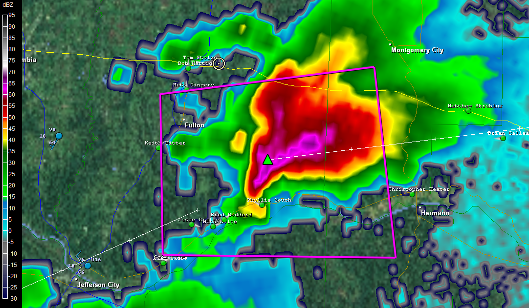 We first intercepted the storm south of Columbia outside the town of Ashland. At that point it was getting its act together and was already tornado warned. The sirens sounded right next to us as we stood and filmed, but the storm had a ways to go before it finally went tornadic. Where we stood southeast of the updraft base, the air was dead calm–not even a breath of inflow, nothing but the year’s first mosquitoes to remind us that spring was well underway south of our home state of Michigan.