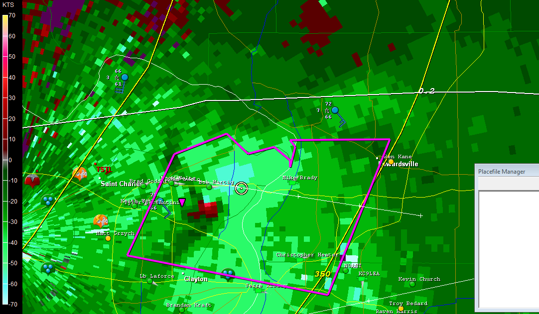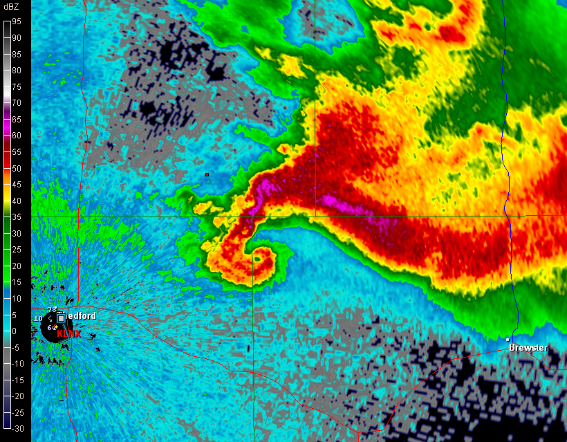 Look at that pinhole in the reflectivity knob! I was even better defined in the ensuing scan, after which the rotation became more diffuse and the storm began to weaken. Prior to this, a few dedicated and fortunate chasers videotaped a nice