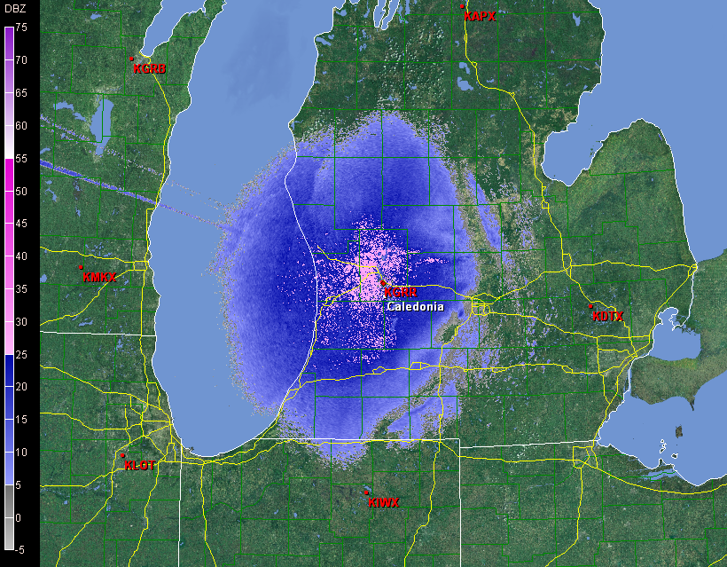 Zang! Another bright flash. I just got a phone call from my friend Brad Dawson, who lives down near Gun Lake. He tells me that a big towerblizzard6-2011500 feet from his house is getting continually struck. That has to be an experience, and from the looks of things, it’s apt to be one that continues through the night. Lacking any similar tall objects here, the lightning isn’t as constant, but it continues to flicker, and the storm itself is intensifying. What the heck–here’s one last image: a current radar scan. I just got a reading of 43.5 Dbz in one of the darker blobs of pink!