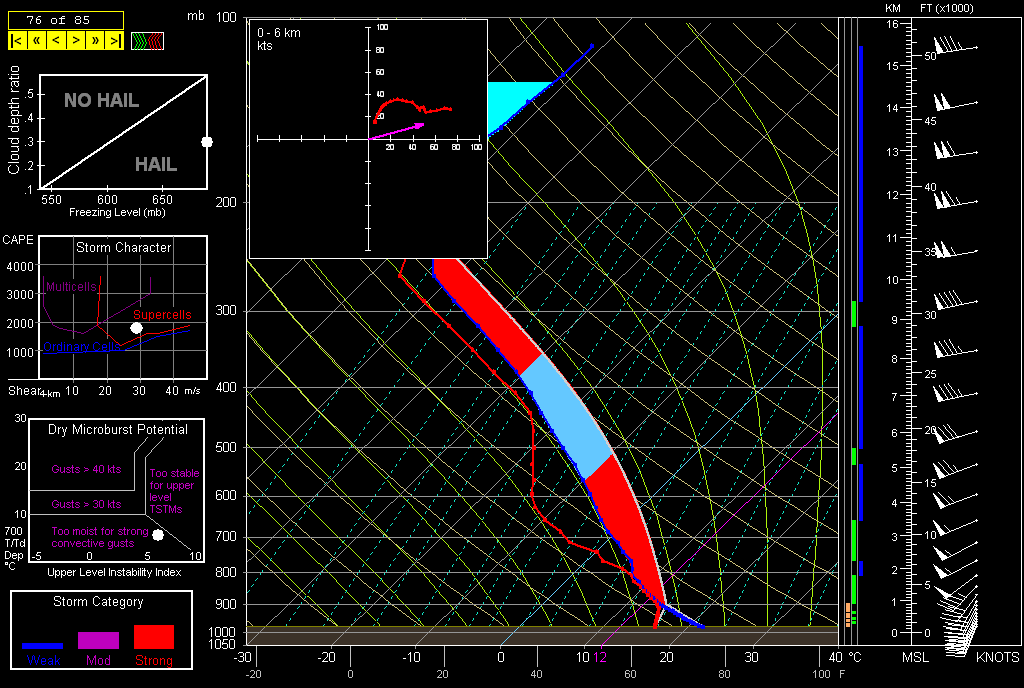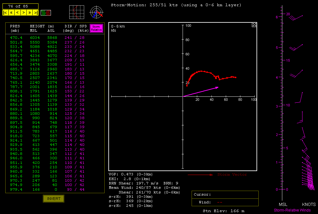 The SPC and NWS offices weren’t the only ones keeping vigilance. Storm chasers across the country were watching the unfolding scenario, among them being my good friend Bill Oosterbaan and me. Here are the February 29 00Z NAM model sounding and hodograph for March 2, forecast hour 21Z, at Louisville, Kentucky. (Click on the images to enlarge them.) With MLCAPE over 1,800 J/kg, 0-6 km bulk shear of 70 knots, and 1 km storm-relative helicity at 245 m2/s2, the right stuff seemed to be coming together. By the time the storms actually started firing, those figures were probably conservative, particularly the low-level helicity, which I recall being more in the order of 400 m2/s2 and up. Simply put, the region was going to offer a volatile combination of moderate instability overlaid by a >50-knot low-level jet, with a 100-plus-knot mid-level jet core ripping in.