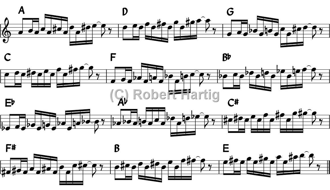 Other than that, I don’t think the exercise needs much explaining. It’s a nice way to build your chops, and it’ll also open your ears, particularly if you play it slowly enough to clearly hear the different intervals.