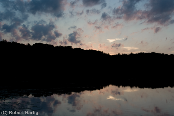 More casts netted me nothing, and presently my interest shifted to the sky. The sun had slipped below the treeline, and a flock of fractocumulus passingĀ overhead articulated the twilight. No fiery sunset, this, no Van Gogh sky; just a gently fading afterglow filled with nuance and calm emotion, silhouetting the forested shoreline and glimmering, spirit-like, in the quiescent mirror of the lake.