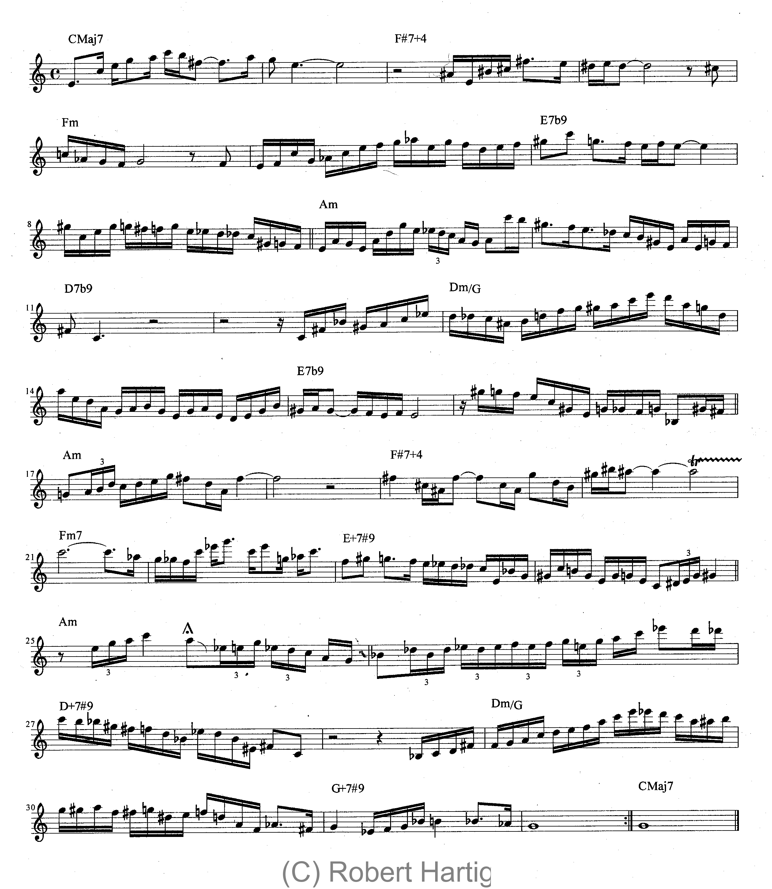 CORRECTION: Now that this article has been posted for a while, naturally I’ve noticed a transcription error in the C and Bb charts. (The original Eb chart is fine.) Since you can easily make the correction mentally, I’m going to simply tell you what it is. In measures 3-4 and 19-20, the chord symbol should not contain a sharp sign. The correct chord in both locations is as follows: for the C chart, A7+4; for the Bb chart, B7+4.