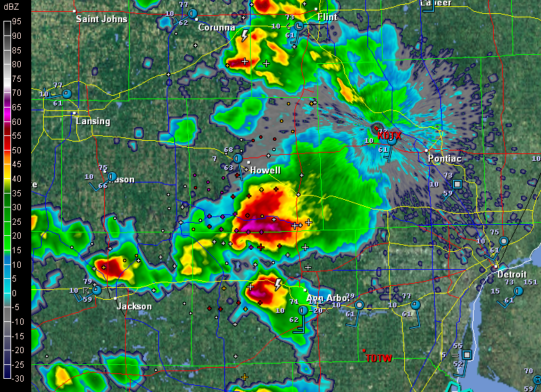 Curious, I took a look at GR3. I’d been glancing at it off and on as the afternoon progressed, watching a small squadron of cells pop up across southern and eastern Michigan. They resembled something I might normally see in July or August. But now, one of them looked different–so unexpectedly different that I had a hard time believing what I was seeing. South of Howell and northwest of Ann Arbor, the most vigorous-looking storm of the bunch had transformed into an unmistakable supercell–a regular flying eagle with a little pinhole BWER in the hook.