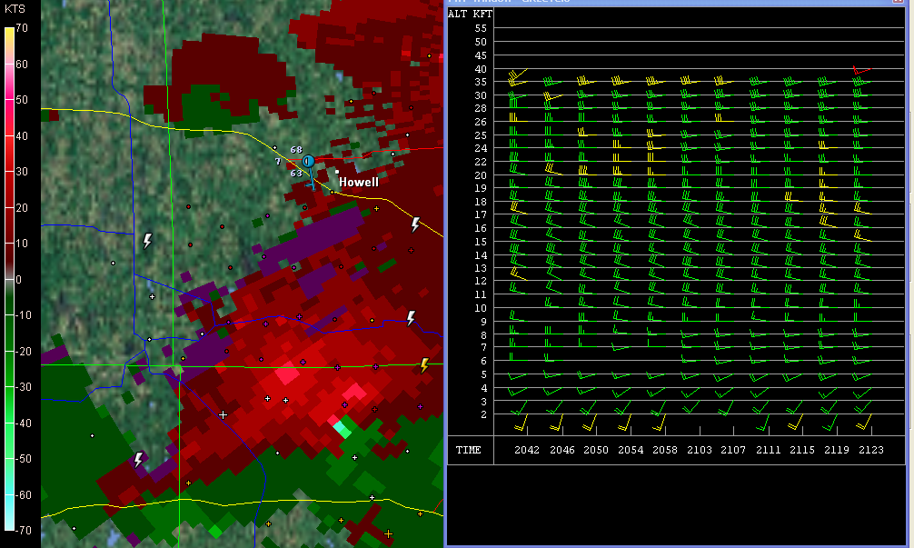 Surely the winds had to be better than I had been led to believe. One way to find out. I pulled up the VAD wind profiler at DTX. Ummm … well, okay. Nothing at all remarkable there. Maybe, given the curviness, enough bulk shear to organize the storm. Obviously that had to be the case; the evidence was staring me in the face, along with a couplet which hinted at the tornadic action that was presently occurring. The last screen capture, just below and to your right, shows both the couplet and the VAD. Enlarge the image, zoom in on it, and you can see for yourself just how meager the winds were and why one would expect storms forming in that environment to drown themselves in their own tears.