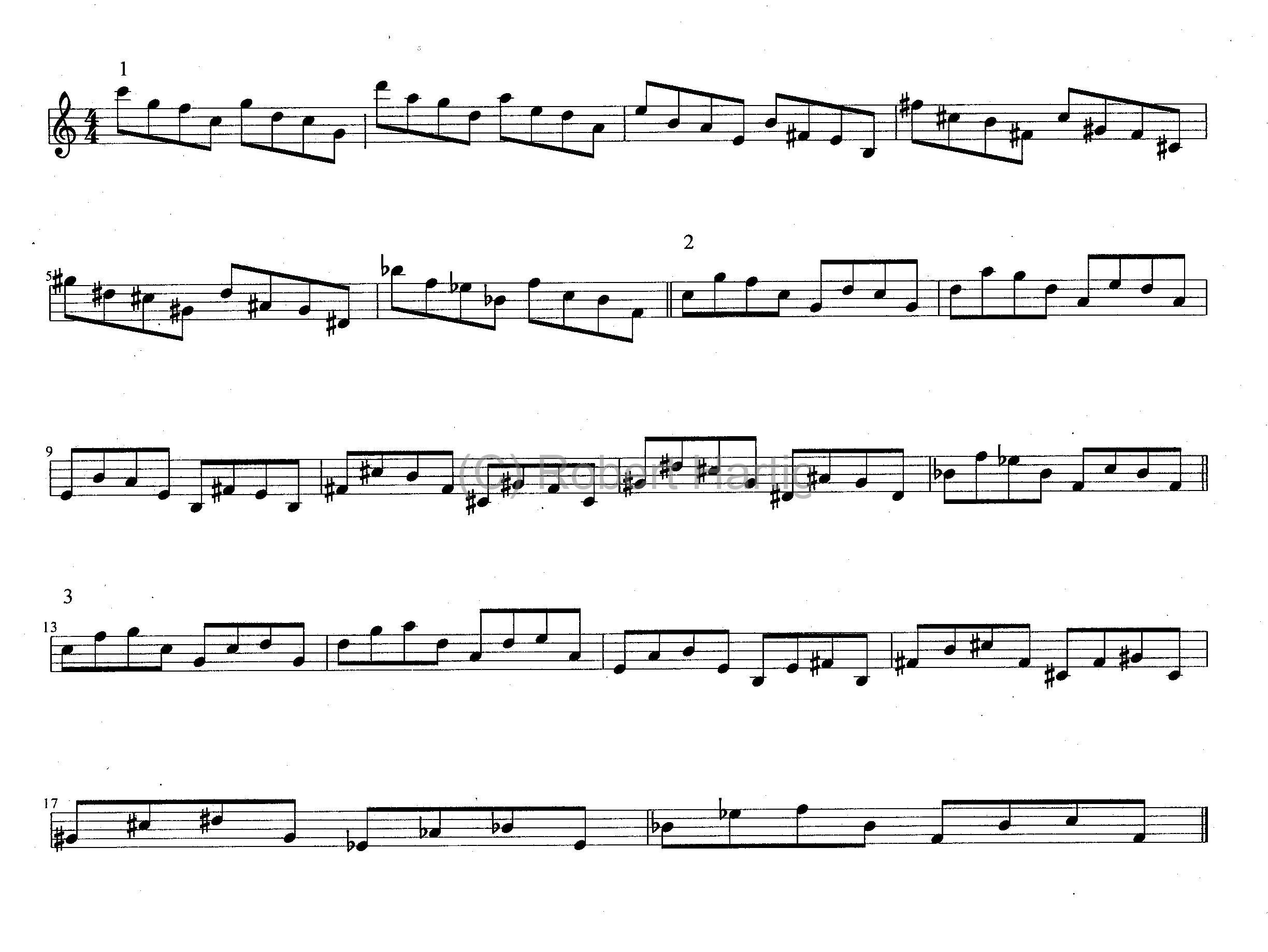 For that matter, you can use as many as five of these patterns in succession within a given key and remain diatonic to the key. The fifth pattern will fill in the last blank, furnishing you with all seven notes in that key. For example, the first two-and-a-half bars of the exercise are all diatonic to the key of C major.