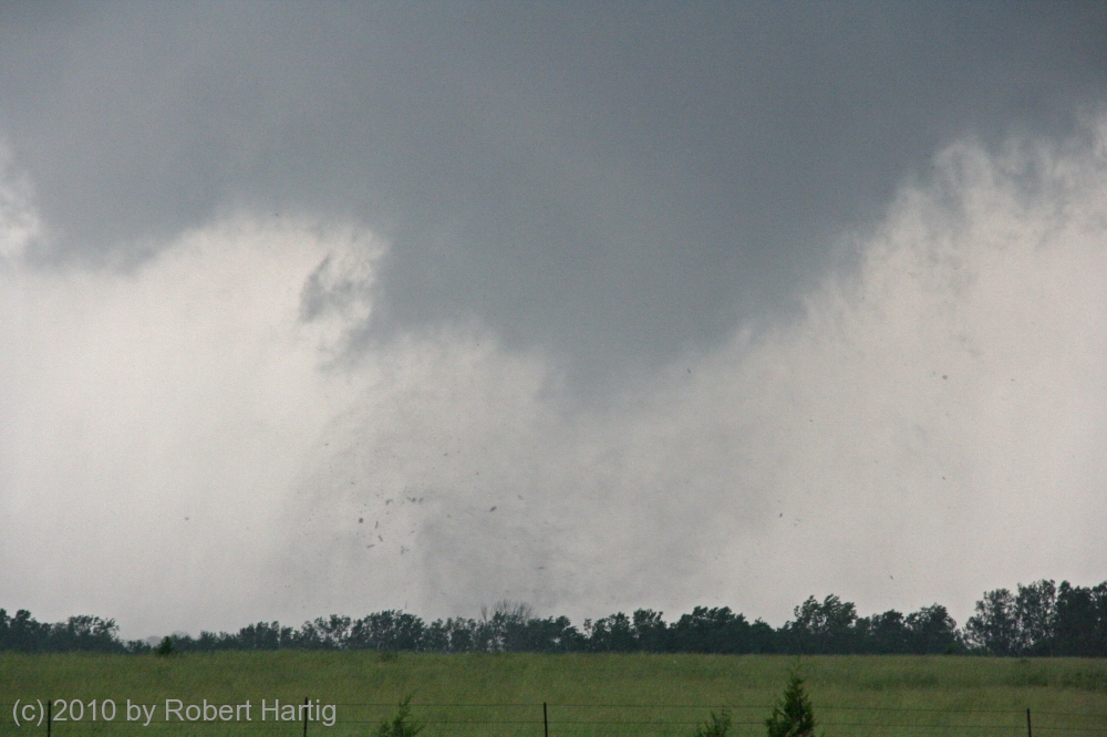 but not in enough time to spare the town. Taking a hard right, it plowed through the town center. Three-quarters of a mile ahead of us, power lines arced and transformers exploded, debris blasted into the air, and a large dust cloud billowed skyward.
