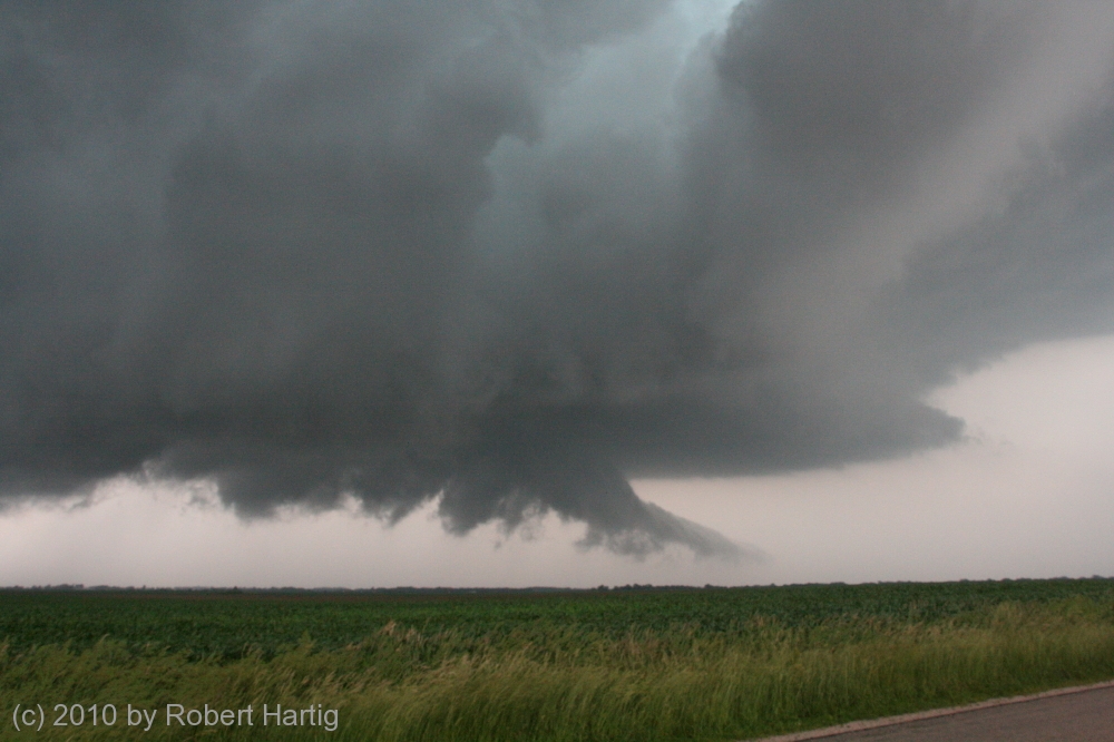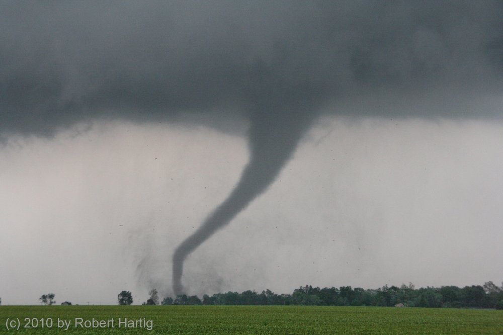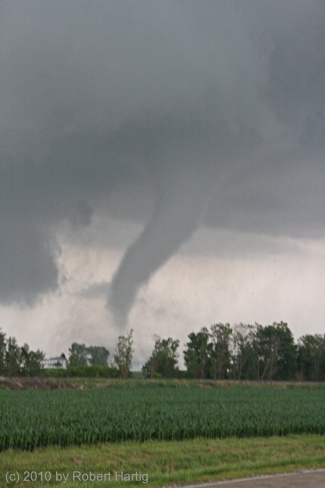 We didn’t have long to wait. A minute or two later, as we proceeded down CR 8, a slender elephant’s trunk of a funnel probed its way earthward, intensified, and began gobbling its way through the corn, closing in to within a quarter-mile of us before turning straight east.