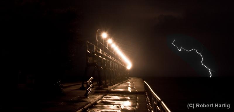 Some of my photos were taken later on, as the second line of storms was moving toward the shore. I’m particularly pleased with my shot of a lightning bolt off to the right of the pier; it’s a moody, mysterious image, and I intentionally left plenty of dark space at the bottom left.