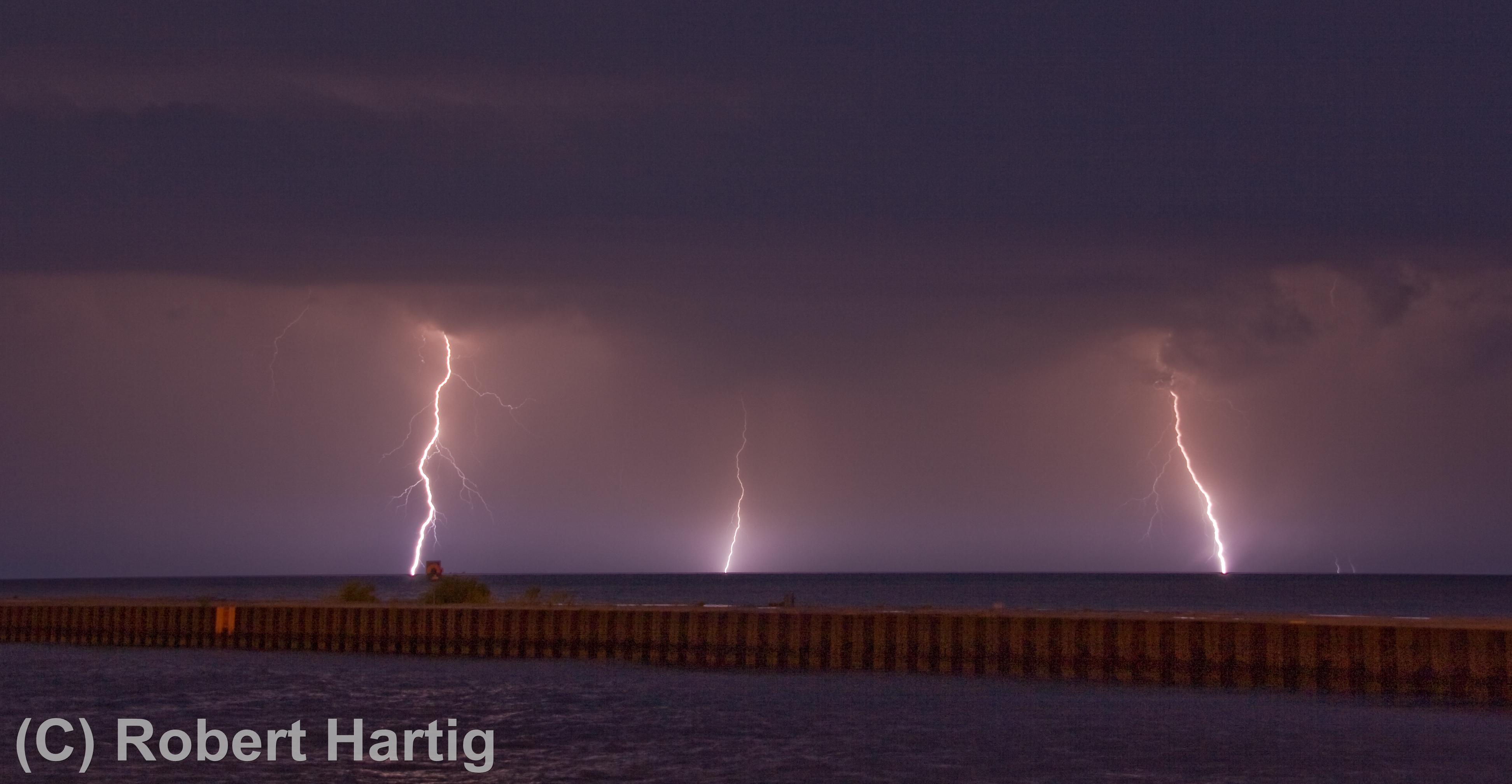 What a great light show! After a lot of teasers this year, I finally got a chance to get some good lightning shots, particularly as the storm moved off to the east. With CGs ripping through the air over South Haven, anvil crawlers lacing the sky overhead, and now and then a brilliant bolt tracing a path from the sky to the lake across the canvas of a molten sunset, yesterday evening was a lightning photographer’s dream. Kurt is a great hand in that regard, and he captured some fantastic images. But for once, even I managed to get some shots I’m pleased with. Here are some of my better ones. Click on them to enlarge them.