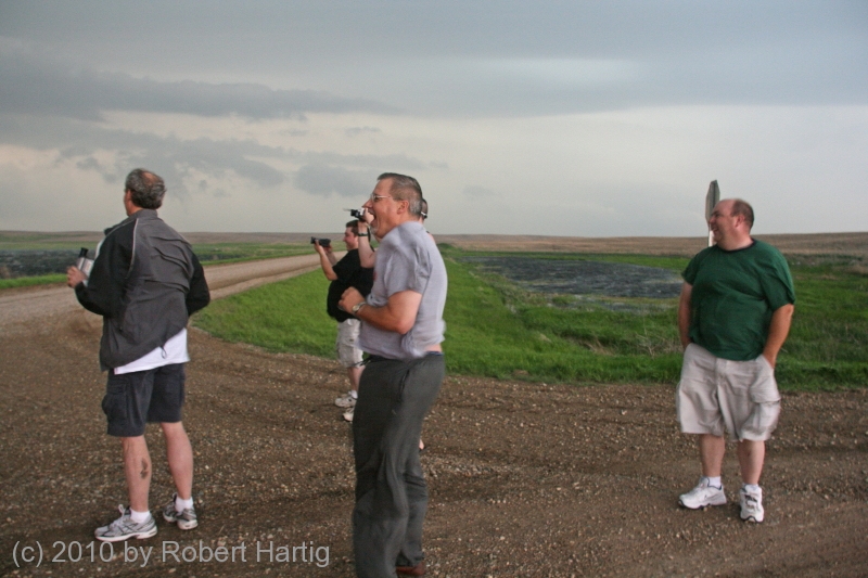Hopping back into our vehicle, we proceeded farther south to the corner of 130th Street, where we once again parked. Here, we bumped into chasers Ben Holcomb, Adam Lucio, Danny Neal, and Scott Bennett. We had last seen these guys at a truck stop in Murdo; now here they were again, along with several other vehicles, all converging out ahead of the meso in the middle of nowhere. In the photo, left to right: Tom, Ben, Bill, and Scott.