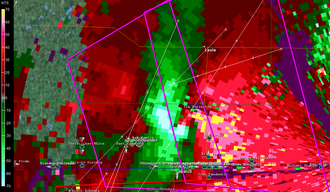 I’ll leave you with two images, both taken when the worst of the storm had just moved past us. One shows some of the vehicles getting slammed by the still-hellacious RFD. The other is a GR3 radar grab of the rotation and our location relative to it, shown by the circular GPS marker.